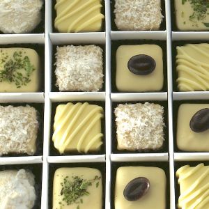 Milk chocolates – Orange & Geranium, Raspberry, Peanut Butter & Cranberry, Pecan & Maple, Toffee Truffle, Hazelnut Praline, Caramel Roast Hazelnut, Redbush Ginger & Honey, Salted Butter Caramel, and Arriba Ecuador Origin. Dark chocolate truffles – Classic French Truffle, Ginger & Cinnamon, Peppermint, Chunky Orange, Darkest Lime, and Venezuela Origin. White chocolates – Chilli & Lemongrass Truffle, Coffee & Vanilla, Raisin & Toasted Almonds, Lemon & Thyme, and Nota Colombia single-origin