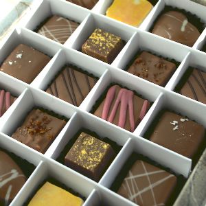 Ingredients: Sugar, cream (milk), cocoa butter, whole milk powder, cocoa mass, emulsifier: soya lecithin, vanilla, raspberries, hazelnuts, almonds, cointreau, scotch malt whisky, ginger essential oil, ginger, orange peel, orange essential oil, butter (milk), cinnamon, limes, mint, peppermint essential oil, ground coffee, water, maize starch, acidity regulator: cream of tartar, lemon oil, colour: E160e, E171, E172, E102, E110, E100